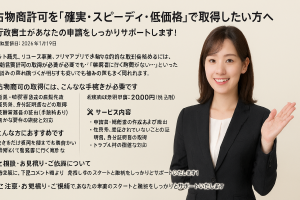 古物営業許可は、ネット販売・リユース事業・フリマアプリでの本格的な取引を行う上で欠かせない許可です。また、「古物商の申請って、意外と大変…」 そんな声をよく耳にします。 当事務所では、業界最安級の料金で、行政書士が確実・ […]