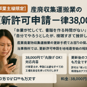 【個人事業主限定】産廃収集運搬の更新代行が38,000円!地域最安値に挑戦中