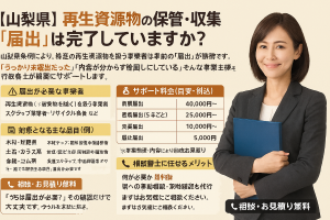 山梨県条例により、特定の再生資源物を扱う事業者は事前の「届出」が義務です。 「うっかり未提出だった」「内容が分からず後回しにしている」そんな事業主様を 行政書士が確実にサポートします。 ⚠️ […]